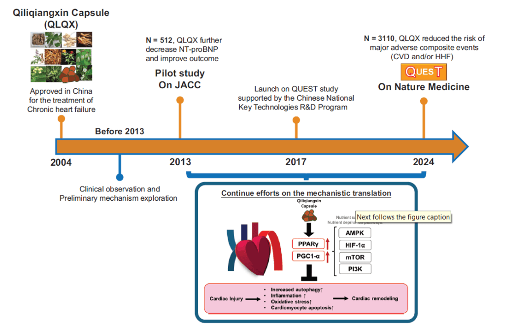 图一 团队围绕芪苈强心进行的研究时间线 2.基础研究进展 芪苈强心胶囊的核心优势在于其多靶点、多途径调控机制。通过11种活性成分的协同作用,芪苈强心胶囊能够同时干预心衰的三大病理机制:能量代谢重塑、炎症抑制以及血管保护。具体而言,芪苈强心胶囊通过激活AMPK-PGC1α通路,改善心肌细胞线粒体功能;阻断PI3K/Akt-mTOR通路,减少心肌纤维化;上调HIF-1α依赖的糖酵解,修复微血管内皮损伤。这种多靶点协同作用不仅能够改善心肌代谢,还能抑制纤维化和调节炎症,为心衰患者提供了全面的治疗方案。 3.临床循证证据 在临床验证方面,前期系列研究显示,芪苈强心胶囊能够在GDMT治疗基础上达到获益,进一步降低HFrEF患者的NT-proBNP水平。其中,QUEST研究是一项纳入3110例HFrEF患者的多中心随机对照试验(RCT)。研究结果显示,中位随访18.3个月后,芪苈强心胶囊组的主要复合终点风险降低了16.7%。这一结果不仅验证了芪苈强心胶囊的临床价值,还为中药疗效评价提供了新的标准。此外,芪苈强心胶囊在安全性方面也表现出色,其不良事件发生率与安慰剂组无统计学差异。 4.循证医学与转化研究:传统医学向现代医学转化的关键 中医药作为中华民族的瑰宝,其理论体系和临床经验蕴含着丰富的科学价值。然而,传统医学与现代医学的融合需要循证医学和转化研究的支撑,以验证其科学性和临床价值。循证医学通过严格的科学研究方法,为中医药的疗效和安全性提供了客观证据;而转化研究则通过从基础到临床的系统性研究,揭示了中医药作用的分子机制和病理生理基础,为中医药的现代化和国际化提供了科学依据。 以QLQX为例,其从基础研究到临床验证的转化医学范式,不仅验证了中医药的科学性和临床价值,也为中医理论的创新提供了重要参考。通过多靶点调控机制的研究,QLQX揭示了中医药复方制剂的复杂作用网络,为中医药的现代化研究提供了新的思路。这种从传统医学到现代医学的转化,不仅体现了中医药的独特优势,也为全球医学的发展提供了新的可能性。 5.未来展望 展望未来,芪苈强心胶囊的研究方向将更加多元化。尽管QLQX在HF治疗中展现出显著潜力,但仍需进一步研究以明确其最佳适应症、剂量和长期疗效,未来研究还应关注QLQX与其他药物的联合治疗策略,以及其在特殊人群(如老年患者和合并症患者)中的疗效和安全性。其次,多组学研究将深入解析芪苈强心胶囊的成分-靶点-通路网络,将指导针对组方机理及潜在药理机制的研究,为个体化用药提供科学依据。最后,全球多中心合作和标准化研究设计将有助于推动QLQX在国际范围内的应用。 6.结语 芪苈强心在HF治疗中展现出独特的优势,系列持续的基础和临床研究不仅标志着我国在转化医学领域的重大突破,也为中医药现代化提供了全球示范。通过持续的基础研究和临床验证。我们期待未来有更多高质量传统医学的转化研究。 作者团队简介: 李新立 教授