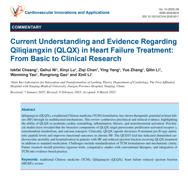 南京医科大学第一附属医院李新立教授团队在《Cardiovascular Innovations and Applications》发表题为《Current Understanding and Evidence Regarding Qiliqiangxin (QLQX) in Heart Failure Treatment: From Basic to Clinical Research》的里程碑式述评,系统梳理了中药芪苈强心胶囊在心力衰竭治疗中的转化医学证据,为传统医学与现代循证医学的融合提供了创新范式。 心力衰竭(心衰,HF)尤其是射血分数降低型(HFrEF)仍是全球健康重大挑战。尽管指南导向药物治疗(GDMT)改善了预后,但病理机制的复杂性仍需突破。芪苈强心(QLQX)作为中国自主研发的中药复方制剂,通过多靶点调控、炎症抑制与心肌保护等机制,成为优化HF治疗的新选择。QUEST研究首次以国际RCT标准验证其心衰硬终点获益,显著降低心血管死亡及心衰再住院风险。本文整合基础研究与临床证据,为QLQX的全球应用提供科学依据。 1.前言 心力衰竭是由于心脏结构和功能异常导致心脏泵血功能下降的复杂综合征。其病因包括高血压、冠心病、心肌病等,症状主要表现为呼吸困难、疲劳和液体潴留。尽管现代医学在HF治疗中取得了显著进展,但许多患者仍存在残余症状,亟需新的治疗策略。 QLQX是一种基于中医理论开发的中药复方制剂,自2004年在中国获批用于慢性心力衰竭治疗以来,通过持续20年的理论-基础-临床转化研究,构建出“活性成分筛选→信号通路解析→硬终点验证”的中药现代化研究范式,其研究成果相继登上《JACC》、《Nature Medicine》等顶级期刊,已积累了丰富的临床和基础研究数据。近年来,随着QUEST等大规模随机对照试验(RCT)的开展,QLQX的疗效和安全性得到了进一步验证。