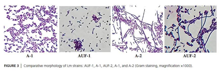 培养基生长实验显示,两菌株存在重要表型差异。AUF-1和A-1在选择性培养基上呈现典型单核增生李斯特菌形态,形成小而圆、半透明、低凸的菌落;而经紫外线诱变获得的AUF-2则表现为显著多形性,主要呈丝状形态。这种形态差异可能与紫外线诱导的细胞分裂相关基因突变有关,但未影响管家基因的MLST分型结果。