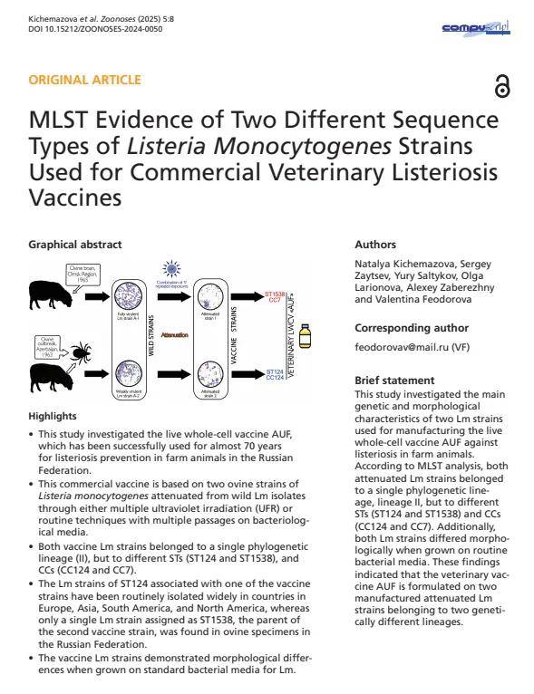 Kichemazova N, Zaytsev S, Saltykov Y, Larionova O, Zaberezhny A, Feodorova V. MLST evidence of two different sequence types of Listeria monocytogenes strains used for commercial veterinary listeriosis vaccines. Zoonoses. 2025, 5(1): 8. DOI: 10.15212/ZOONOSES-2024-0050
