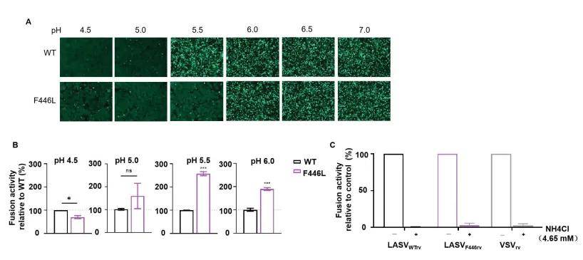 图2:F446L显著提升病毒膜融合阈值(pH 5.5实现完全融合)