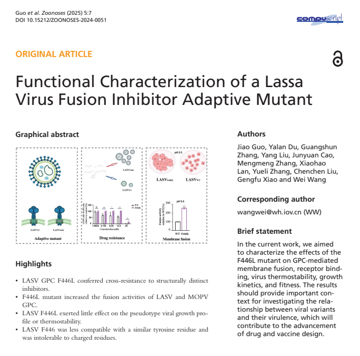 Guo J, Du YL, Zhang GS, Liu Y, Cao JY, Zhang MM, Lan XH, Zhang YL, Liu CC, Xiao GF, Wang W. Functional characterization of a Lassa virus fusion inhibitor adaptive mutant. Zoonoses. 2025, 5(1): 7. DOI: 10.15212/ZOONOSES-2024-0051