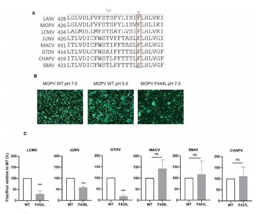 2.跨物种保守性:在莫佩亚病毒(MOPV)中引入对应突变(F444L)后,其GPC融合性显著增强(图6B)。对于拉沙病毒所在属的其他病毒引入相对应突变后,融合能力变化趋势不一致,表明F446L的促融合效应具有病毒种属特异性。