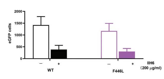 1.受体结合能力保留:α-肌萎缩蛋白糖苷(α-DG)受体结合实验显示(图3),IIH6单抗可同等抑制野生型与F446L突变体的细胞感染(抑制率均>70%),证实突变不影响GP1与α-DG的相互作用。