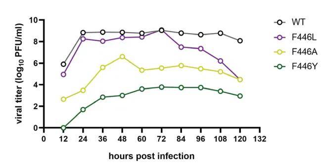 3.跨膜区残基兼容性:F446位点对电荷残基(精氨酸/天冬氨酸)完全不容忍,无法获得稳定病毒颗粒;而结构相似的酪氨酸(F446Y)虽可形成感染性病毒,但滴度骤降至10⁴ PFU/mL(野生型为10⁸ PFU/mL),揭示该位点对芳香族残基的严格依赖性。