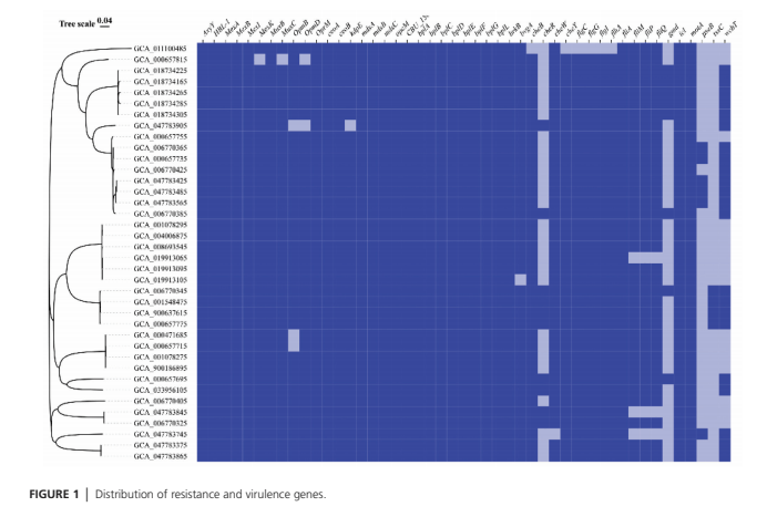 2. 毒力保守性:28 种毒力基因被检出,其中与宿主入侵相关的 bplA-L 基因簇(除 bplL 外)在所有菌株中存在,调控毒力表达的 BvgAS 双组分系统检出率达 97.4%,鞭毛相关基因(flgC、flgG、fliA 等)均提示该菌具备强和组织定植能力。核心毒力基因的高保守性(检出率 > 92.1%)是其跨宿主感染的重要分子基础。
