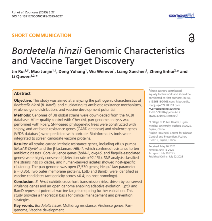 Jin R, Mao JJ, Deng YH, Wu WW, Liang XC, Zheng EH, Li QW. Bordetella hinzii genomic characteristics and vaccine target discovery. Zoonoses. 2025; 5(1): 27. DOI: 10.15212/ZOONOSES-2025-0027