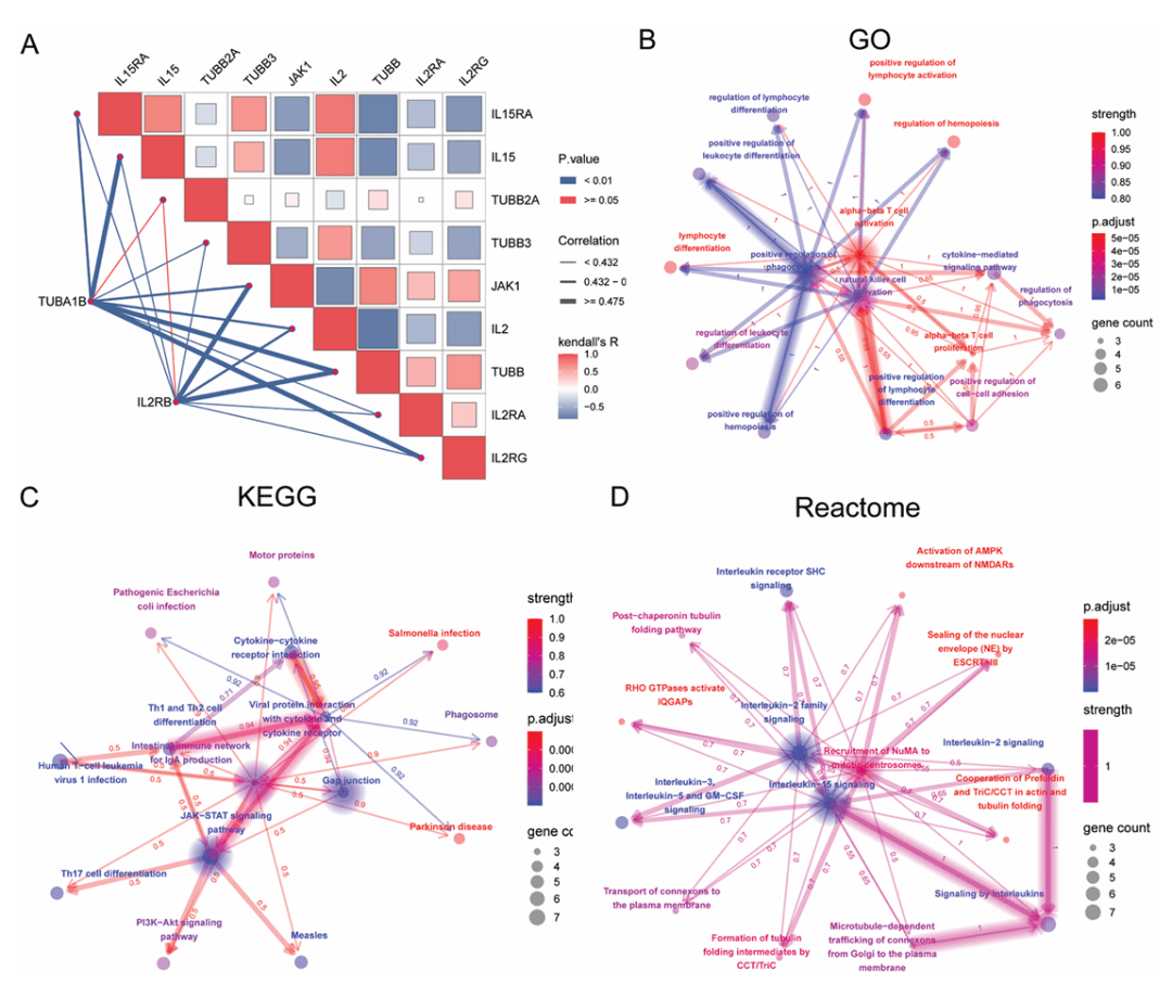 图1本研究对音乐治疗、阿尔茨海默病(Alzheimer’s disease,AD)相关基因以及运动相关基因进行了综合分析。 从单细胞数据库(GSE140831 和 GSE48624)中提取差异表达基因(differentially expressed genes,DEGs),并与音乐治疗、阿尔茨海默病及运动相关基因进行交集分析,最终鉴定出两个核心基因:IL2RB 和 TUBA1B。此外,利用 GSE115071 和 miRTarBase 数据库进行差异表达 microRNA(DE-miRNAs)分析,共鉴定出 8 个关键 miRNA。随后构建了基因–miRNA 相互作用网络,并进行了蛋白质–蛋白质相互作用(protein-protein interaction,PPI)分析。借助 GSVA 和 TIMER 工具对这些基因在糖酵解及免疫浸润中的作用进行了功能探索。差异表达分析显示了对照组与阿尔茨海默病组之间的表达差异,而 GO 功能富集与通路分析进一步阐明了这些基因的生物学功能与作用通路。与此同时,网络药理学分析揭示了这些基因作为潜在药物靶点的应用前景。综上所述,本研究通过整合多种生物信息学方法,系统性地分析了音乐治疗、阿尔茨海默病及运动相关基因之间的关系及其潜在作用机制 2. 通路富集分析 GSVA分析表明IL2RB与TUBA1B显著富集于糖酵解、顶端连接、TGF-β信号通路; GO/KEGG分析揭示其参与IL-15/IL-2信号通路、JAK-STAT通路、HTLV-1感染及Th1/Th2细胞分化。 3. 免疫微环境调控 TIMER工具分析显示: