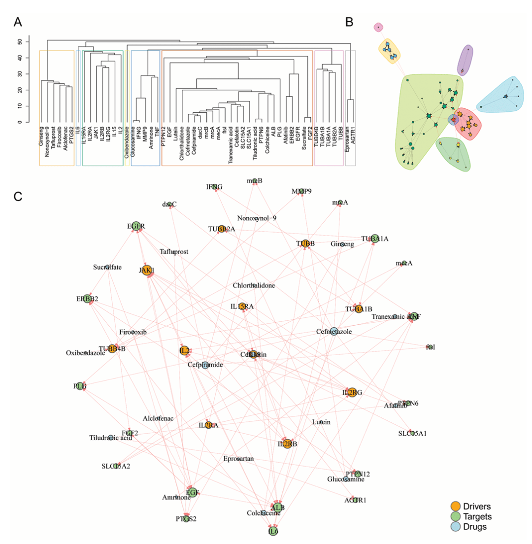 图3 构建 mRNA-miRNA 网络 5. 药物-靶点互作预测 聚类分析显示化合物与基因在多层次网络中具潜在交互; 网络药理学模型构建基因-药物-疾病驱动互联网络,节点大小反映连接数,边厚度代表相关性强度(图4C); 最短路径分析提示IL2RB与TUBA1B与已知AD药物靶点具有网络邻近性,具备成药潜力。