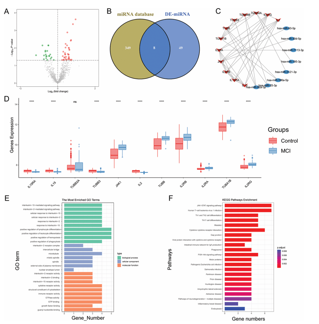 图2 确定关键基因及其功能 4. mRNA-miRNA网络 从GSE115071识别57个DE-miRNAs(20下调、37上调),与miRTarBase数据库交叉获8个关键miRNAs; 构建包含11个mRNAs与8个miRNAs的调控网络,提示其在神经保护与炎症调节中的复杂调控; 差异表达验证显示多数PPI网络基因在MCI组中显著表达异常。