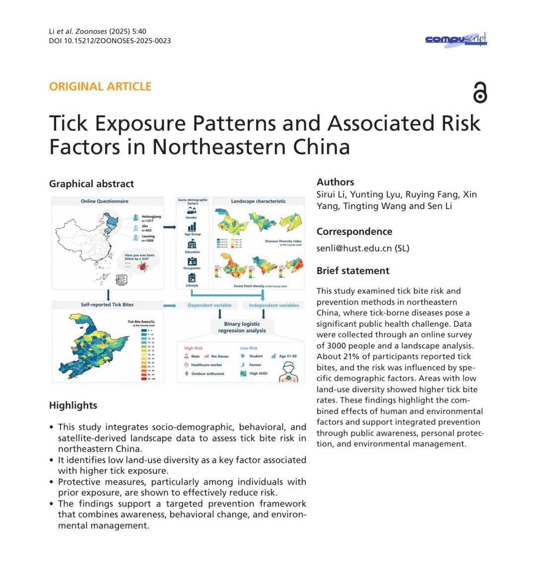 蜱虫(Tick)作为一种吸血节肢动物,是仅次于蚊子的第二大重要病原体传播媒介,可携带多种病毒、细菌和原生动物,引发蜱传脑炎(TBE)、莱姆病(LD)及发热伴血小板减少综合征(SFTS)等疾病。中国东北地区是蜱传疾病的高发区。随着城市化加速和生态旅游兴起,土地利用格局逐渐变化,栖息地碎片化加剧,人与自然互动频率增加,人群蜱虫暴露风险持续升高。 近期,华中科技大学李森副教授团队在《Zoonoses》发表题为《Tick Exposure Patterns and Associated Risk Factors in Northeastern China》的原创研究。该研究通过对黑龙江、吉林、辽宁三省居民进行在线问卷调查,利用卫星遥感数据进行景观分析,首次系统揭示了中国东北地区居民自我报告的蜱虫叮咬状况,并结合二元logistic模型综合分析了人群特征、行为模式、景观格局与蜱虫叮咬之间的复杂关联,为理解人群蜱虫暴露的多维机制提供了重要证据。 研究结果显示,21%的受访者报告在过去两年内有蜱虫叮咬史,80.3%的受访者报告采取了五项及以上防护措施。年龄、性别、职业、生活行为方式等因素与蜱虫叮咬显著相关。土地利用类型单一的地区表现出更高的蜱虫暴露风险。 该研究为提升公众认知及个人防护水平、优化区域生态管理策略提供了科学支撑,对中国东北地区蜱传疾病的精准防控具有重要参考价值。