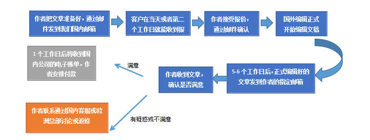 3, 作者同意报价后,5000 单词以内的文章将在5-6个工作日之内编辑好并且发到作者邮箱,5000单词以上需要7-8个工作日,账单将在一个工作日后通过电子邮件发到您邮箱。